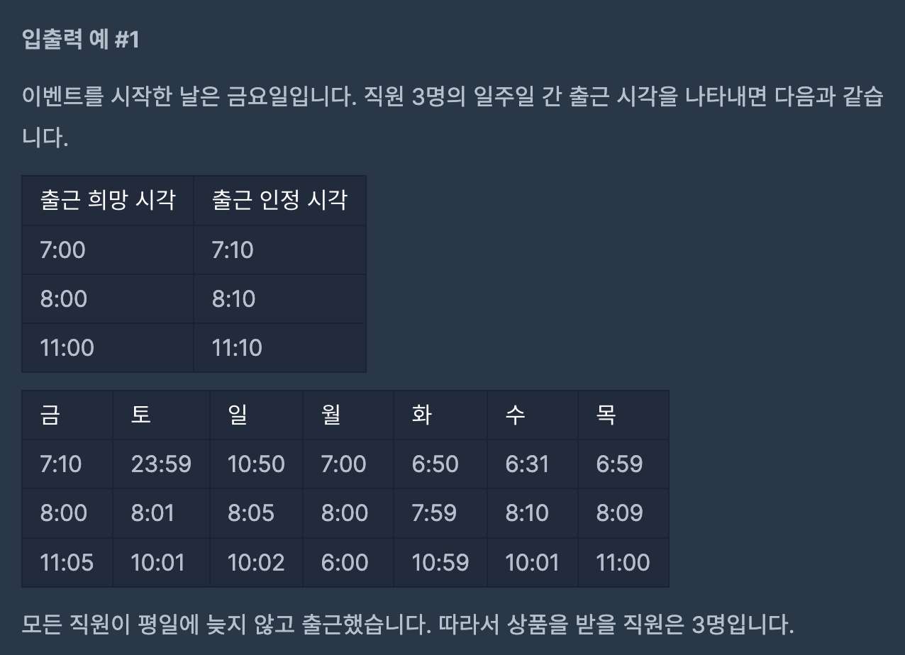 [프로그래머스] [2025 프로그래머스 코드챌린지 2차 예선] 유연근무제(Java) 본문