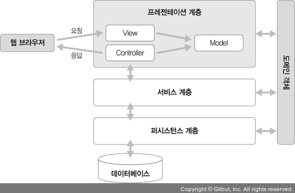 도메인 객체 -> 퍼시스턴스 계층 -> 서비스계층 -> 프레젠테이션 계층(컨트롤러-> 뷰)