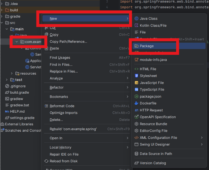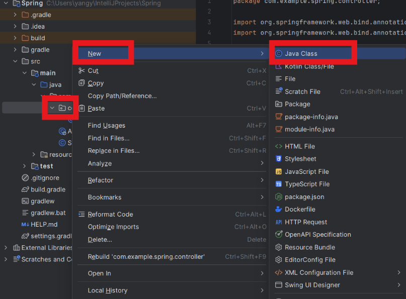 src > main > java > com.example.spring 내에 controller라는 패키지를 생성합니다.